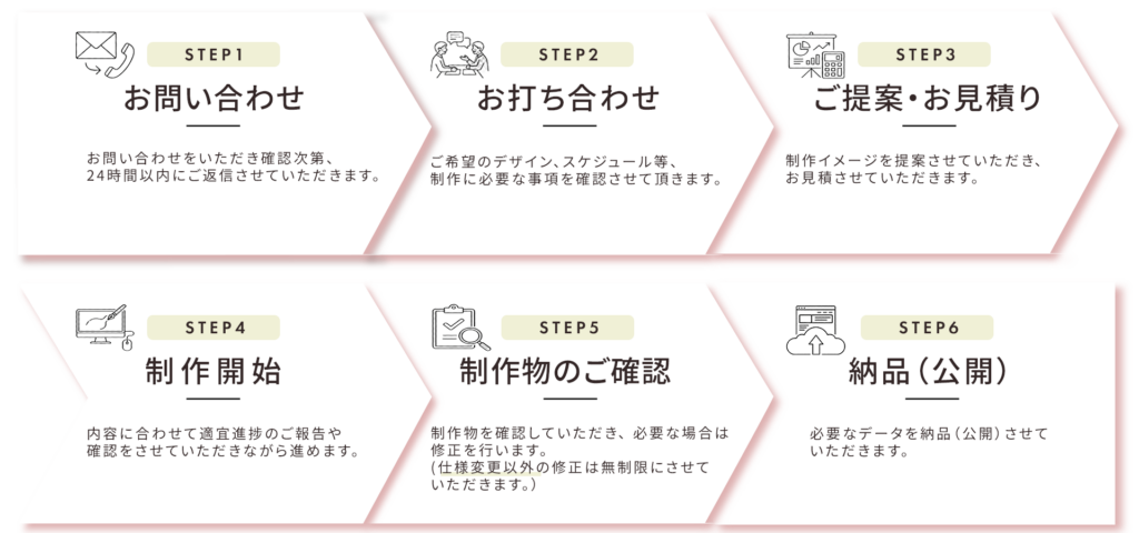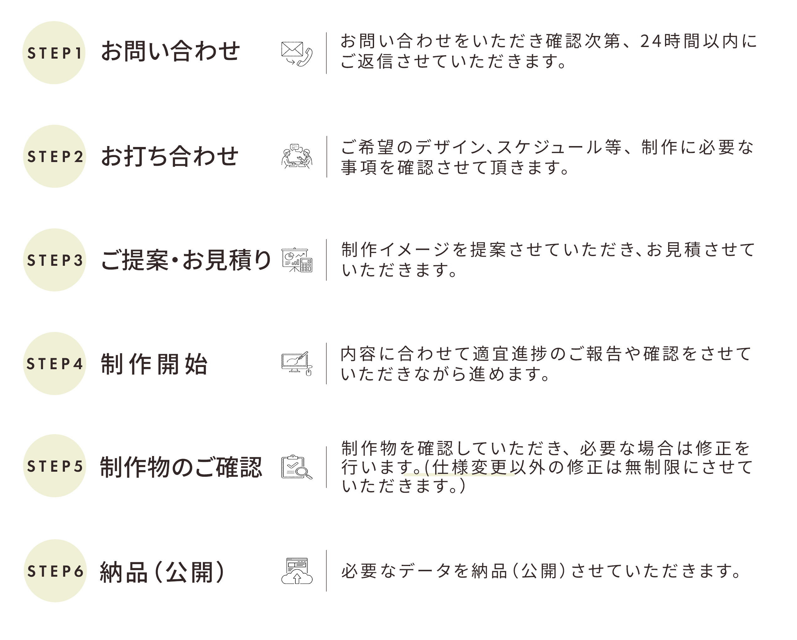 デザイン・構成・必要な素材など、迷わないよう順序立ててご案内します。
