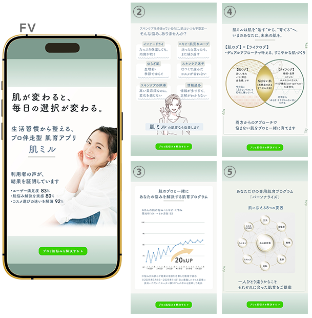 全体を通してシンプルで誠実なトーンにまとめ、「肌の科学的信頼感 × 親しみやすさ」を両立する配色とデザインを意識しています。