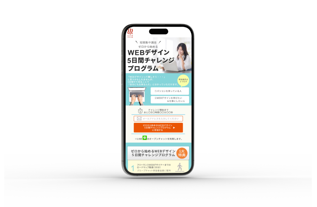 ■ターゲット:40代前後 男性女性。割合は30対70。WEBデザインに興味がある人。 あるいは、在宅で働ける仕事を探している人向け。■目 的:無料のWEBデザイン5日間チャレンジに参加してもらうこと。 チャレンジ後には、最後に講座案内もする予定です。■サイズ:スマホ特化を意識して750px■ポイント40代男性女性がターゲットで、割合は30対70で女性が多いですが、30%の男性も取りこぼさないようピンク系の色を避けました。文字は読みやすい源ノ角ゴシックを使用しています。スマホに特化したLPなので流されやすいことを意識して、目に留まるよう『WEBデザイン5日間チャレンジプログラム』の文字だけを一番大きく太い文字にしました。また、読み手が5日間チャレンジしている姿がイメージしやすいように、PCを使用しているところの画像を選定。