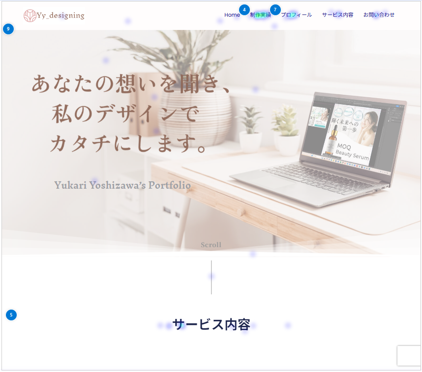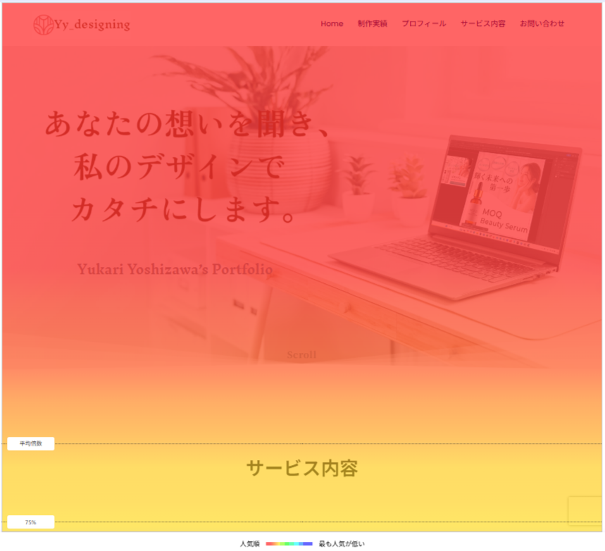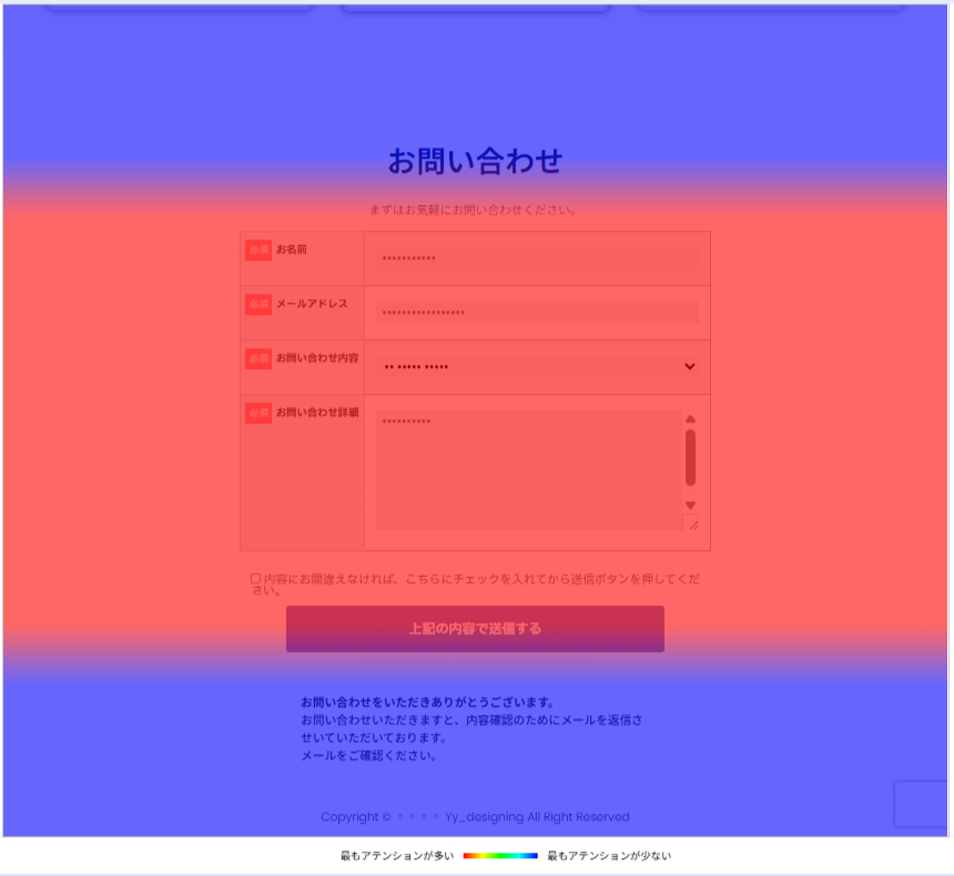 ユーザーがページ上でどれくらいの時間滞在したかを色で表示(よく読まれている場所が濃い赤に)。 右側の画像がサイト全体を表示しています。赤い部分は問合せセクションです。 みて欲しいセクションが見てもらえていないことがわかります。