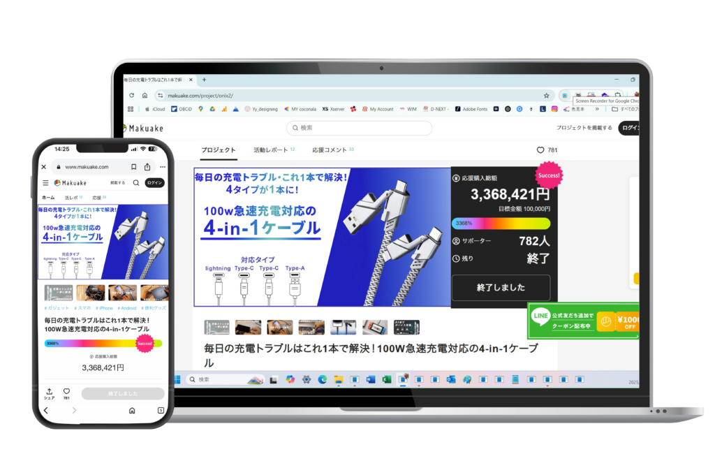 ■ターゲット: 20-40代男性■目的:makuake.comのファーストビュー(新規向け)■サイズ:1200 ×620px■ポイント新しい商品や体験を応援購入できるプラットフォームです。クラウドファンディングの一種で、まだ世の中にない製品やサービスを、実行者がサポーターの応援購入によって実現を目指す仕組みのサイトに掲載なので、信頼感を感じられる青にして、商品画像がシルバーなので、コードの質感も伝わるよう濃い青にしています。物販なので文字が悪目立ちしないようグラデーションを入れました。