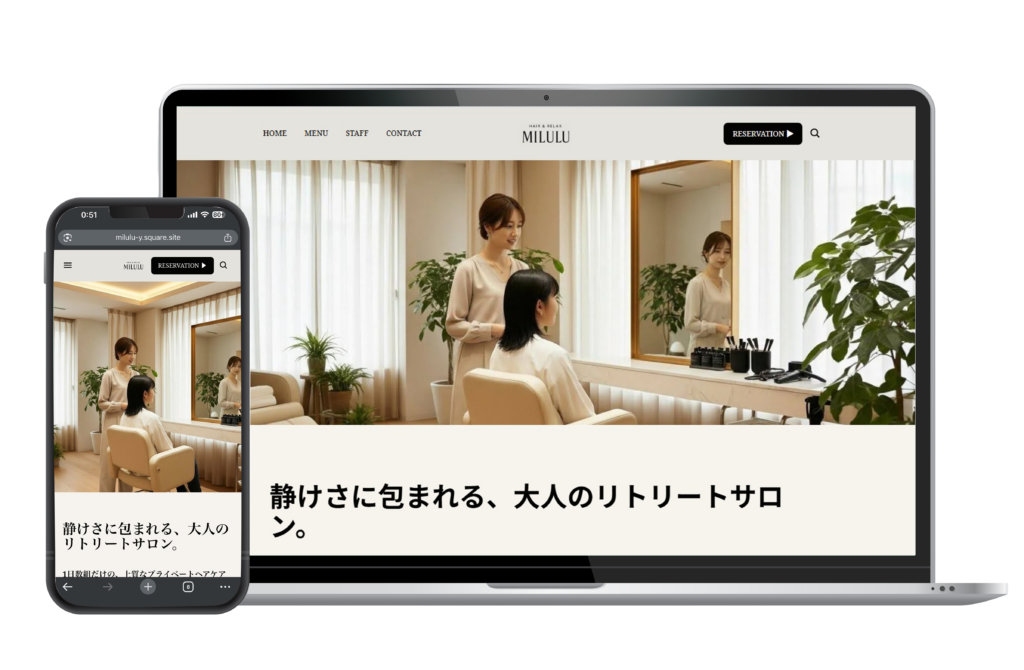 ■店舗名:Hair & Relax Milulu(ミルル)■特徴:完全予約制・1席のみのプライベートサロン■ターゲット:30代~40代の落ち着いた大人の女性■トーン&スタイル:モノトーンを基調にした、無駄を省いた上質なデザイン■完全予約制のプライベートサロン。お客様お一人おひとりの髪と丁寧に向き合うため、1日限定数組のみ予約を受けている。 落ち着いた空間と、髪と心に寄り添う時間を届ける。■完全予約制・1席のみというサロン特性を軸に、「静けさ」「上質感」「大人の余白」を重視して設計しました。ベージュ×木目の落ち着いた配色と写真の引き構図で空間の広がりを演出。スマホ閲覧を前提に、予約導線は視認性を高め、迷わず行動できる構成にしています。